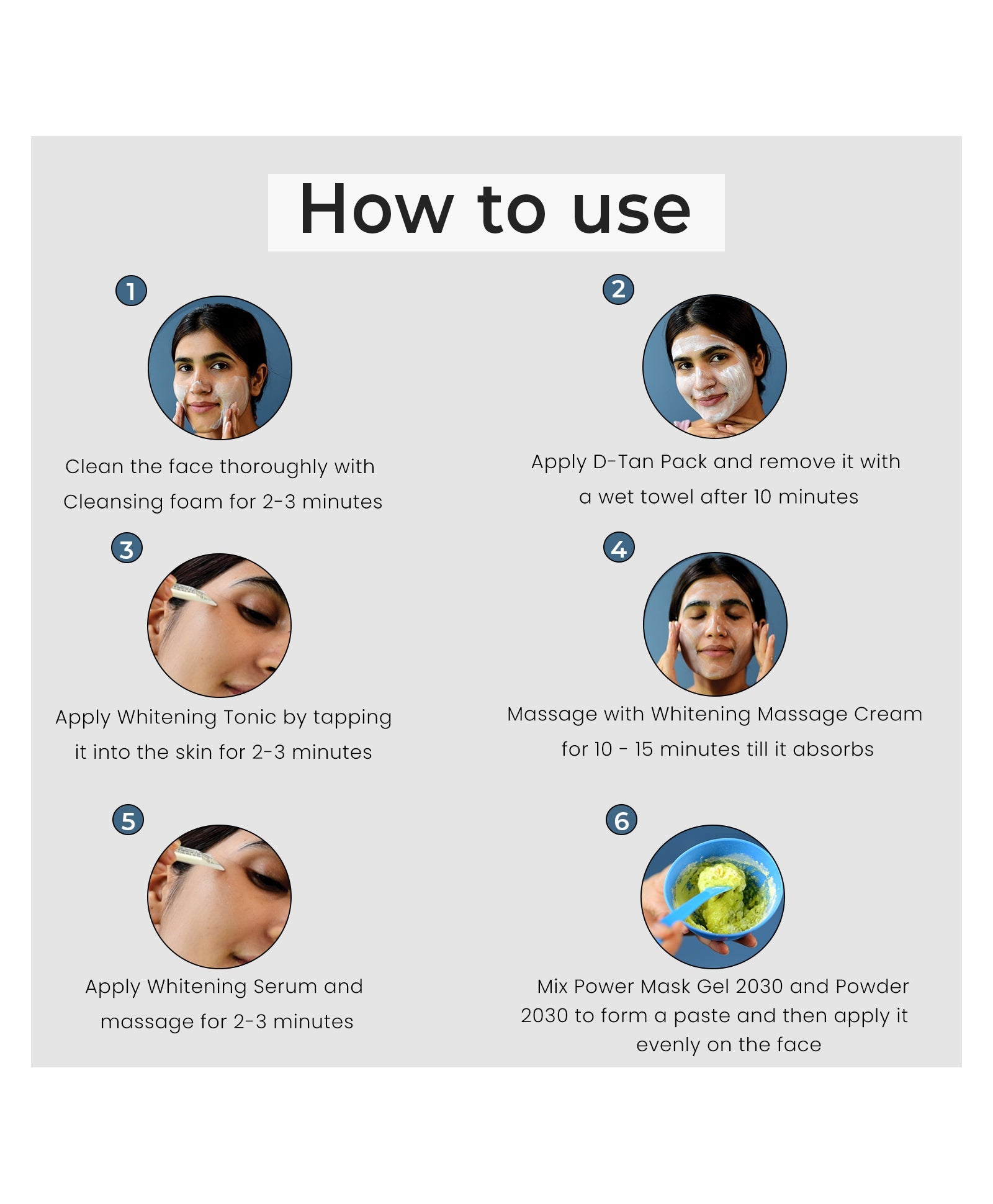 Facial Power Gel & Powder 2030: Mix the Facial Power Mask Powder 2030 & Gel 2030 to form a paste. Apply all over for 10-15 minutes. After that peel off the mask.