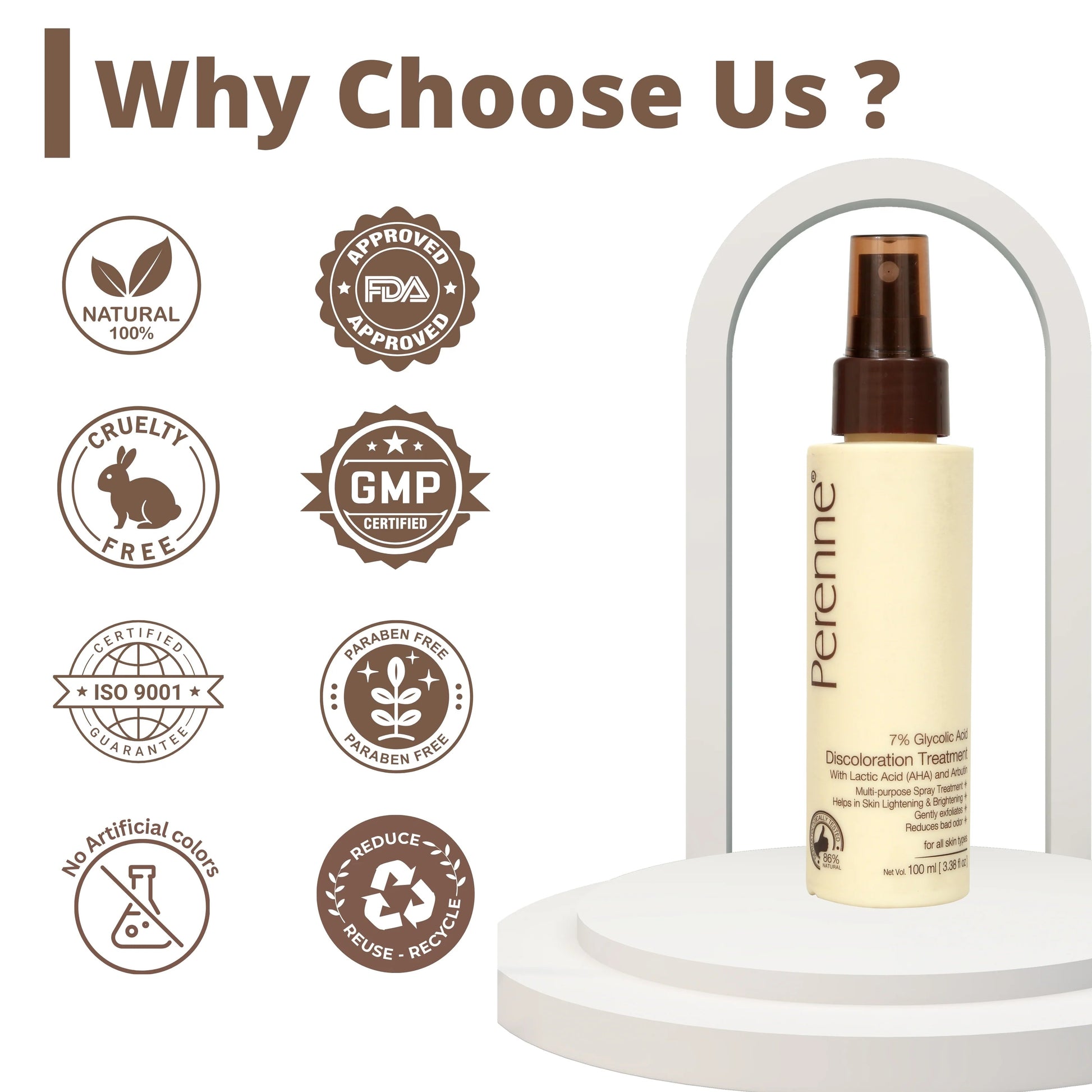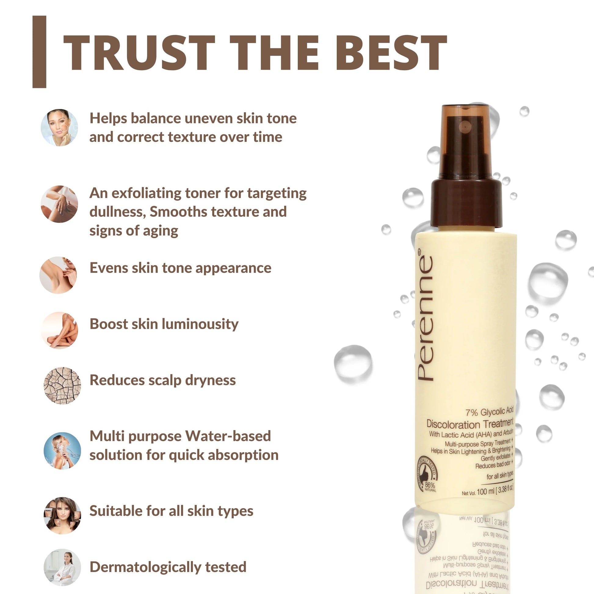 Perenne 7% Glycolic Acid Discoloration Treatment Spray for Skin Brightening | Controls Body Odour | Helps reduce the darkness and pigmentation of underarms, elbows, neck, knees, and inner thighs | Multiple purpose spray for Face, Body and Scalp | 100ml